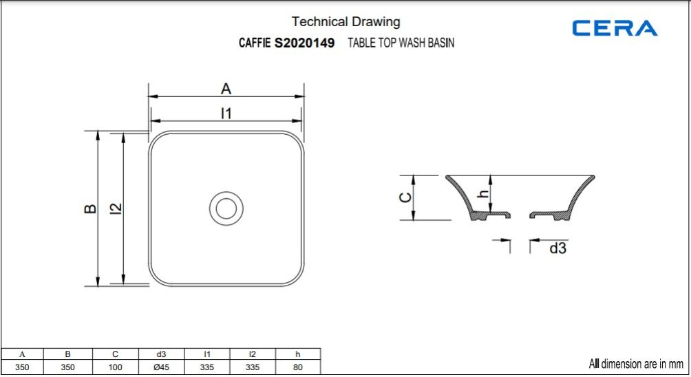 Thin Rim Counter Top Wash Basin | S2020149 | size: 350 x 350 x 100 mm