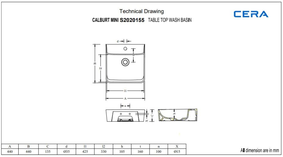 Mini Counter Top Wash Basin | S2020155 | Size: 440 x 440 x 135 mm