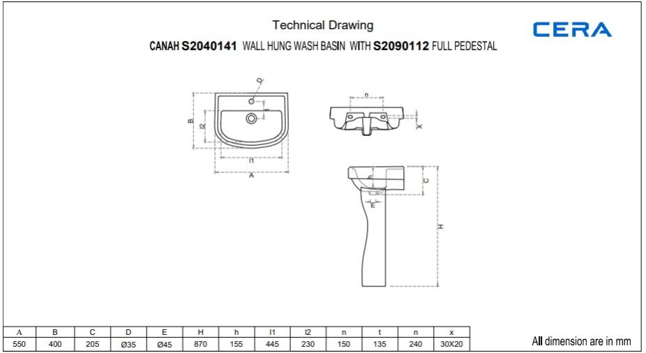 Wall Hung Wash Basin with full pedestal height 870 mm | (Basin) S2040141 | (Pedestal) S2090113 | Size: 550 x 400 x 205 mm