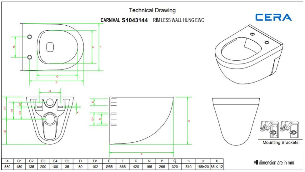 Rimless wall Hung WC | S1043144 (With Duroplast Seat Cover) | S1043148 ( With Soft Close Seat Cover ) | Size: 510 x 365 x 380 mm
