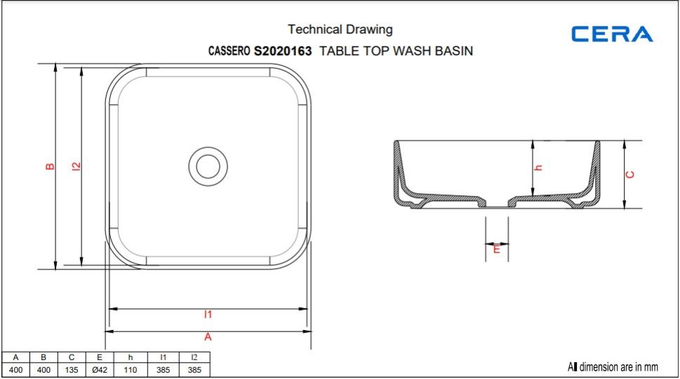 Thin Rim Counter Top Wash Basin | S2020163 | Size: 400 x 400 x 140 mm