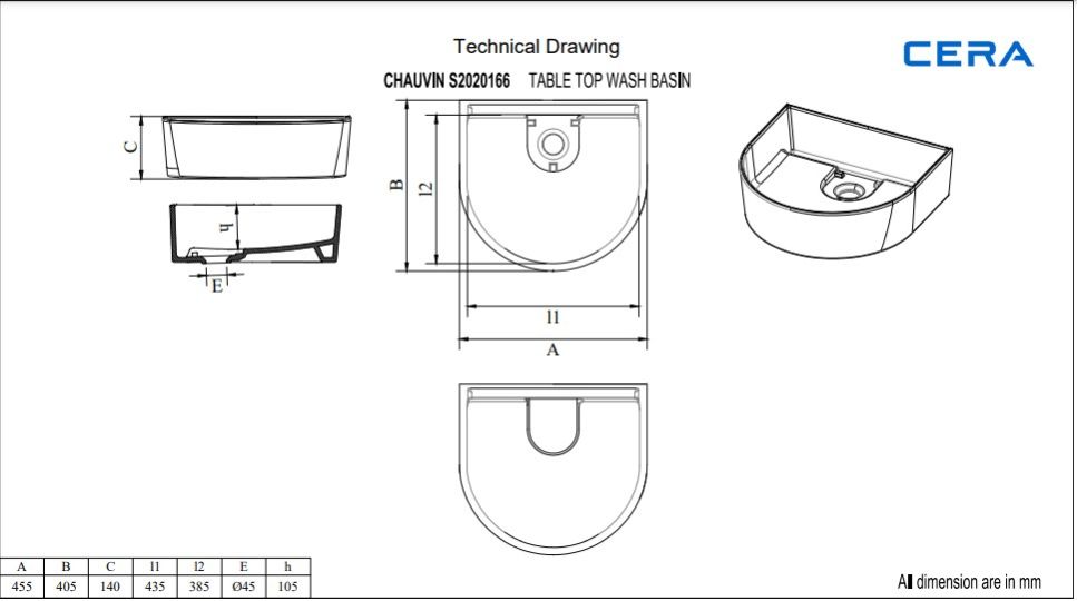 Thin Rim Counter Top Wash Basin | S2020166 | Size: 455 x 410 x 140 mm