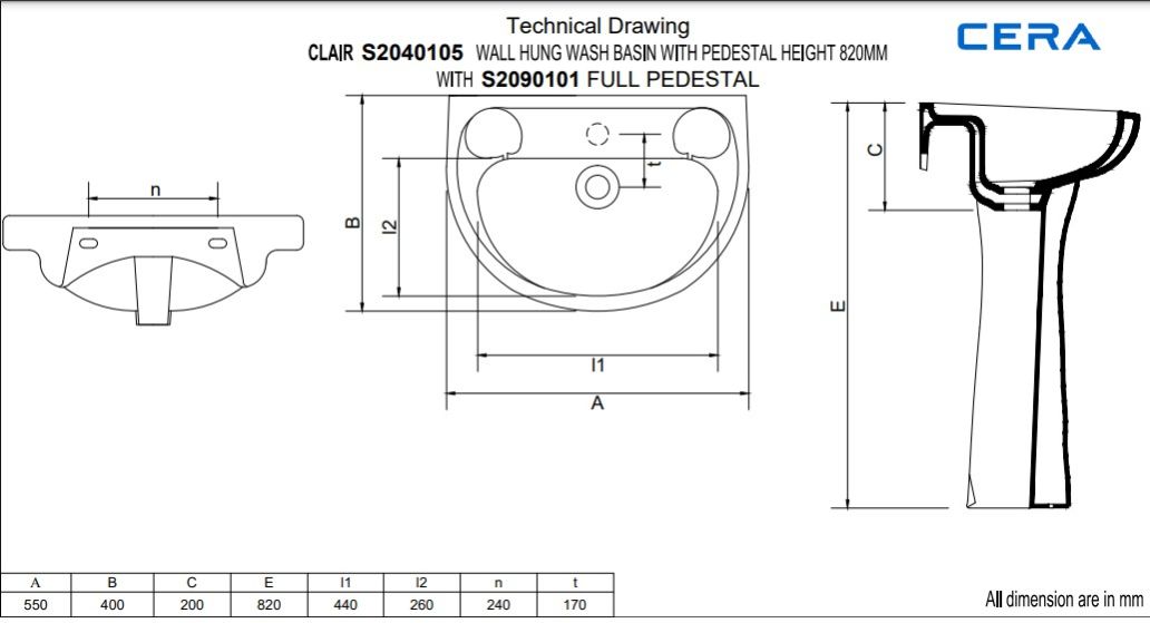 Wall Hung Wash Basin with full pedestal height 820 mm | (Basin) S2040157 | (Pedestal) S2090101 | Size: 550 x 400 x 200 mm