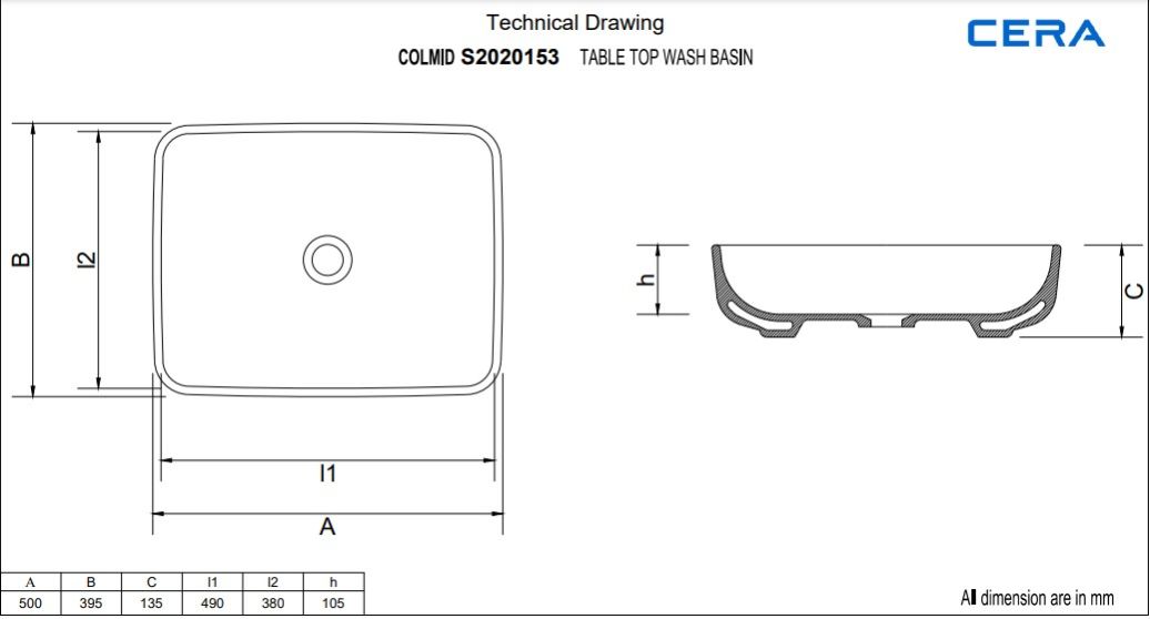 Thin Rim Counter Top Wash Basin | S2020153 | Size: 500 x 395 x 135 mm