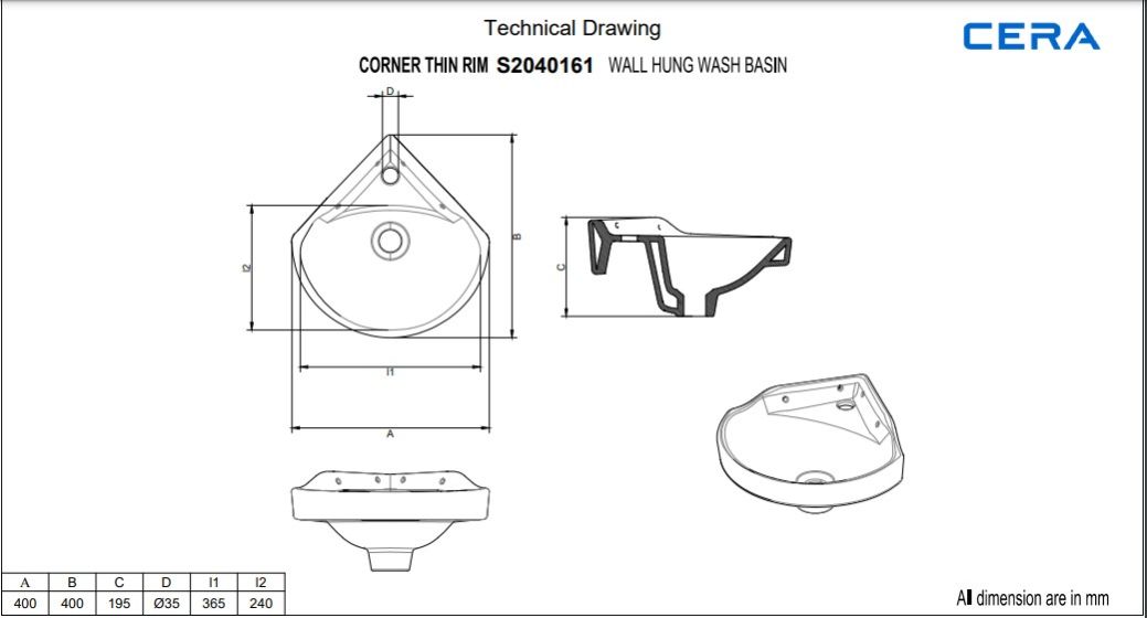Wall Hung Wash Basin | S2040161 | Size: 400 x 400 x 195 mm
