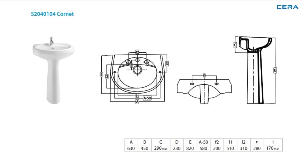 Wall Hung Wash Basin with full pedestal height 820 mm | (Basin) S2040104 | (Pedestal) S2090101 | Size: 630 x 450 x 290