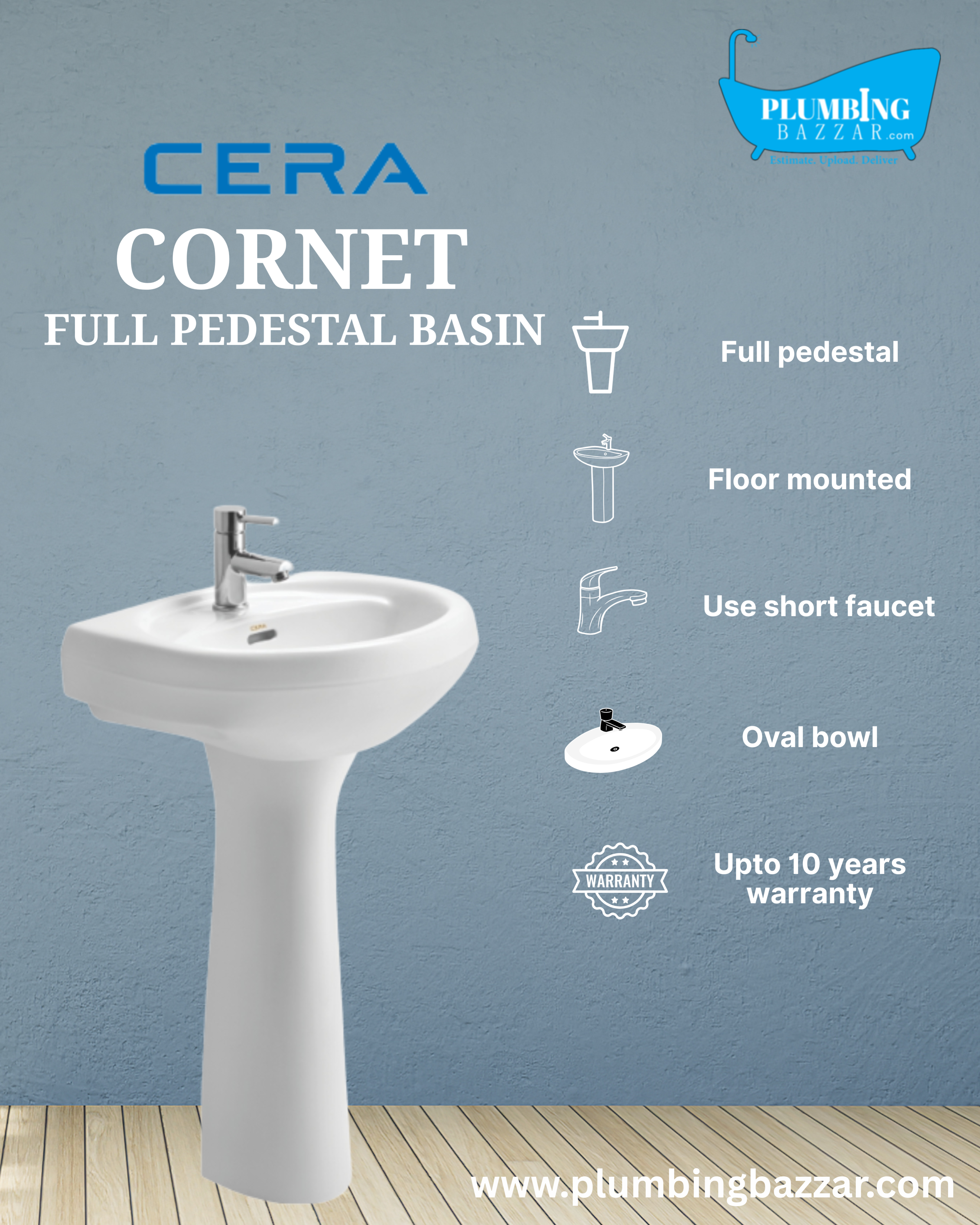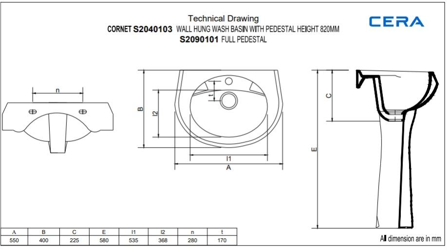 Wall Hung Wash Basin with full pedestal height 820 mm | (Basin) S2040103 | (Pedestal) S2090101 | Size: 550 x 400 x 225 mm