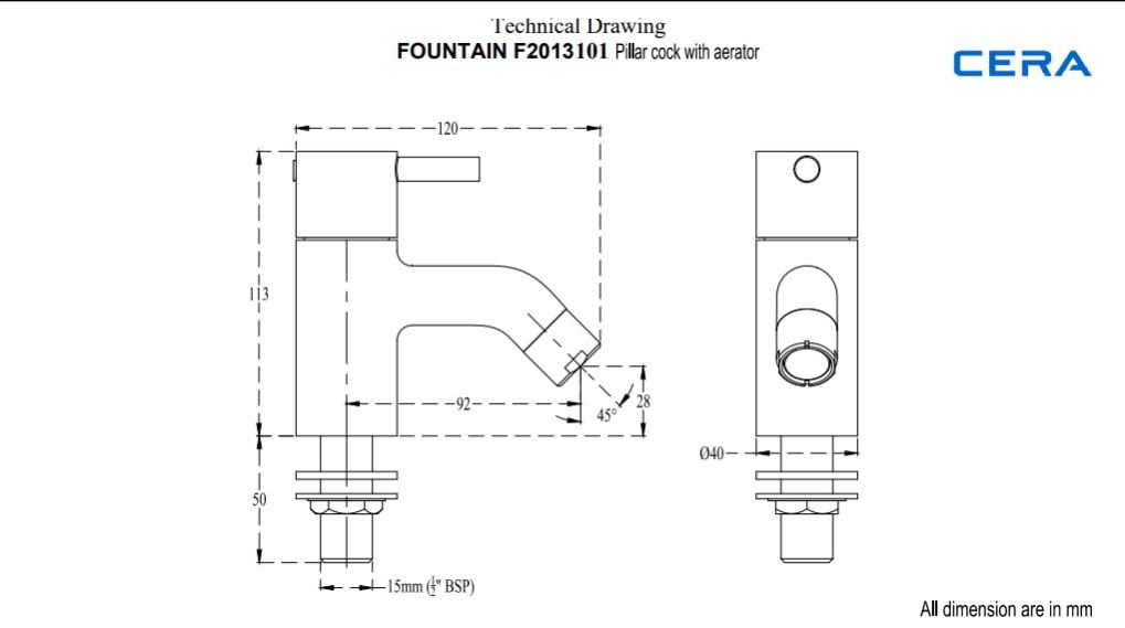 Faucet Type: Fountain Quarter Turn Pillar cock with aerator