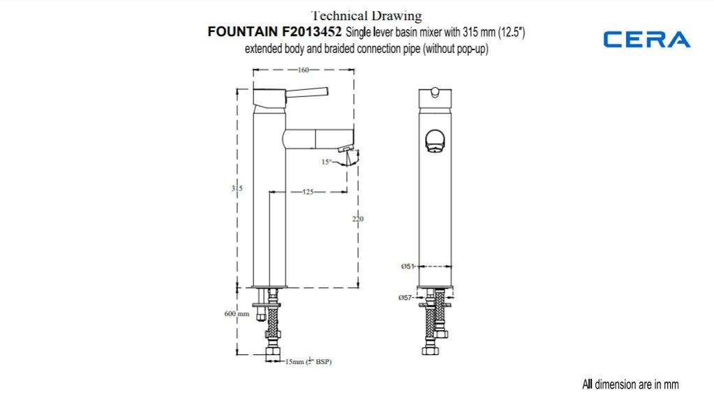 Faucet Type: Fountain Single lever Tall basin mixer Hot & Cold with 315 mm (12.5") extended body and 600 mm braided connection pipe without pop-up