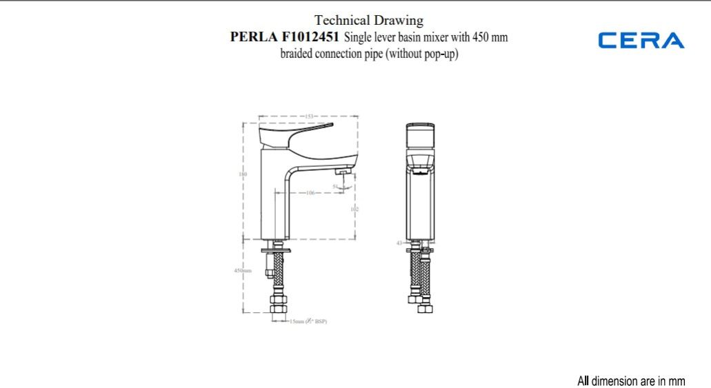 Perla | F1012451 | Single lever basin mixer Hot & Cold with 450 mm braided connection pipe without pop-up