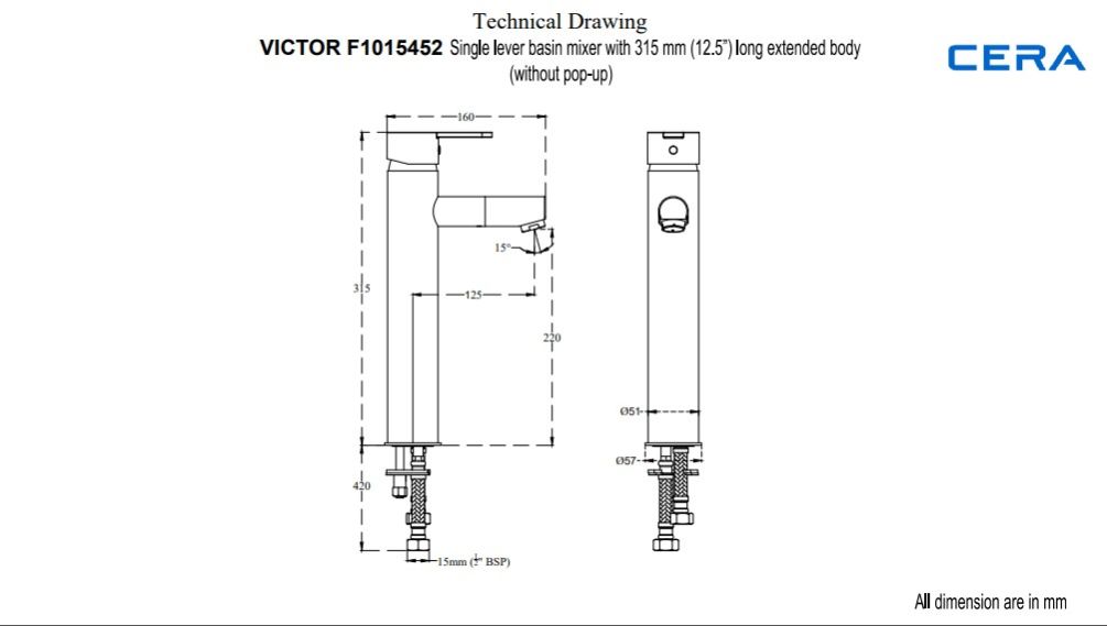 Faucet Type: Victor Single lever Tall basin mixer Hot & Cold with 315 mm (12.5”) extended body and 600 mm braided connection pipe without pop-up