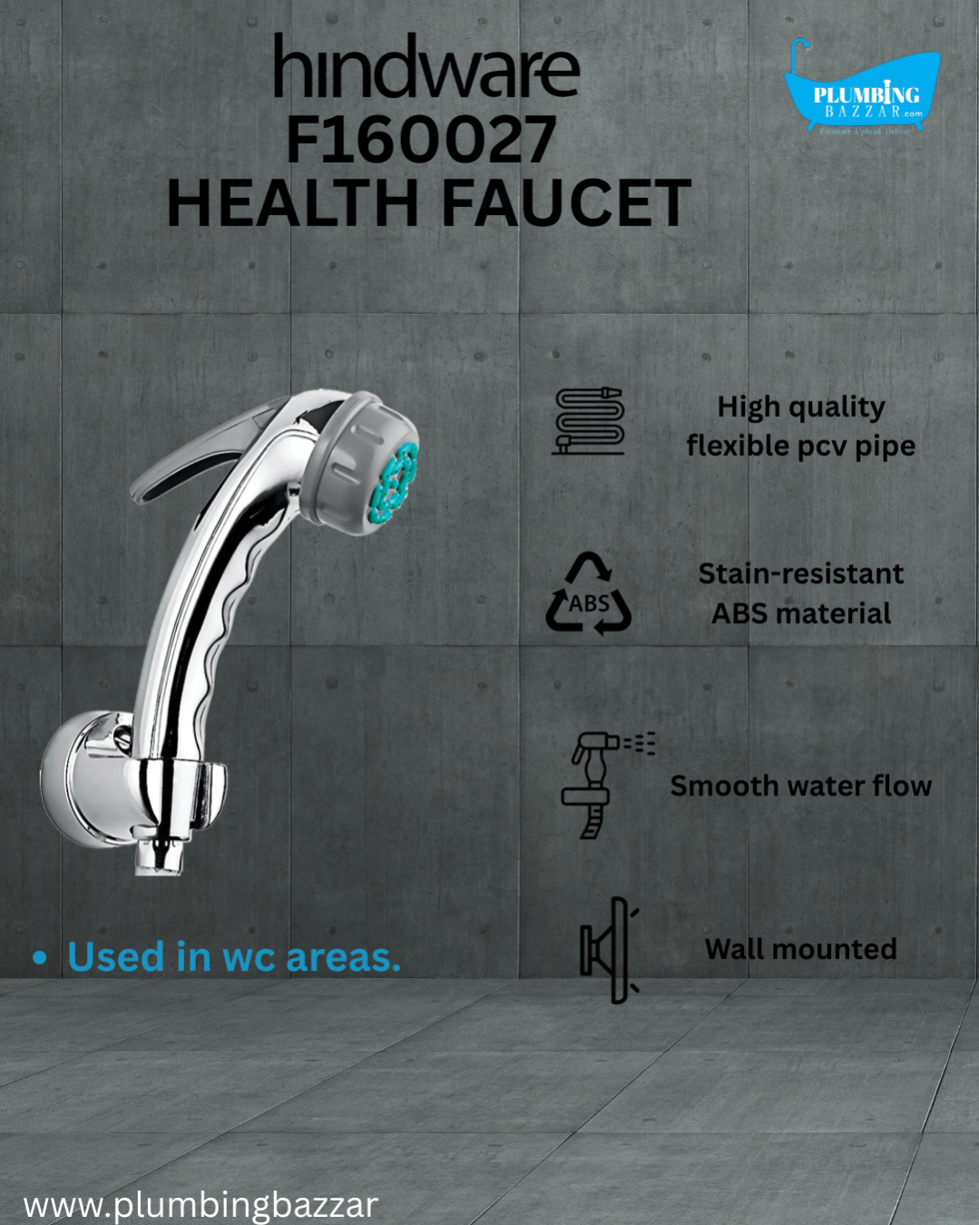 Operated with Trigger Control: A Wall Hook is Attached to Wall Which Holds Health FauceHealth Faucet ABS with Rubbit Cleaning System, 1.25 m Long PVS Flexible Tube & ABS Wall Hook.