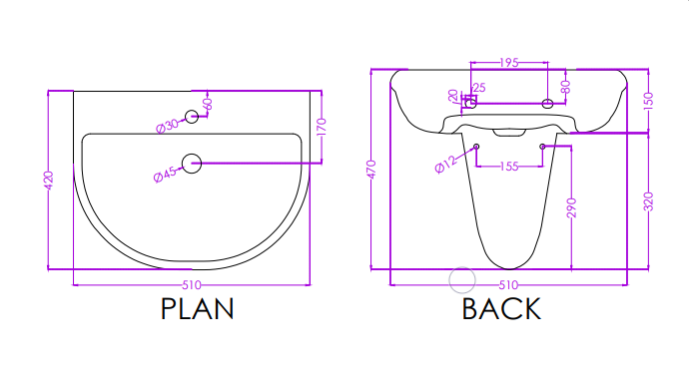 Half Pedestal Basin | P8215PW0203 (Basin), P8217PW0002 (Half Ped) | Dimensions : 510x415x145mm