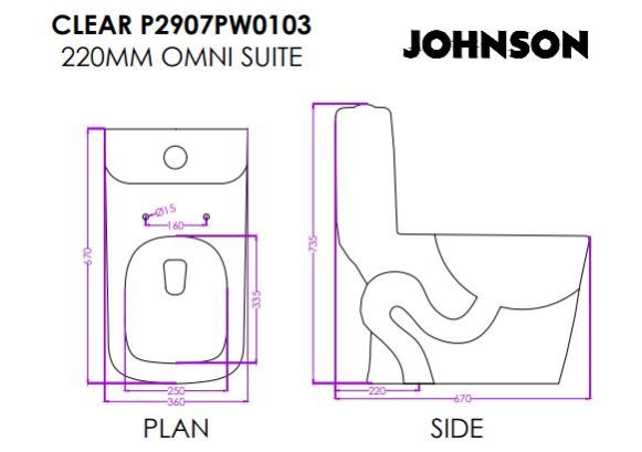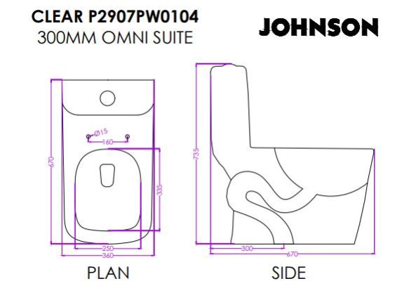 Omni Suite One Piece Commode | P2907PW0103 (S220mm) ; Dimensions : 645x360x735 | P2907PW0104 (S300mm) ; Dimensions : 730x360x660