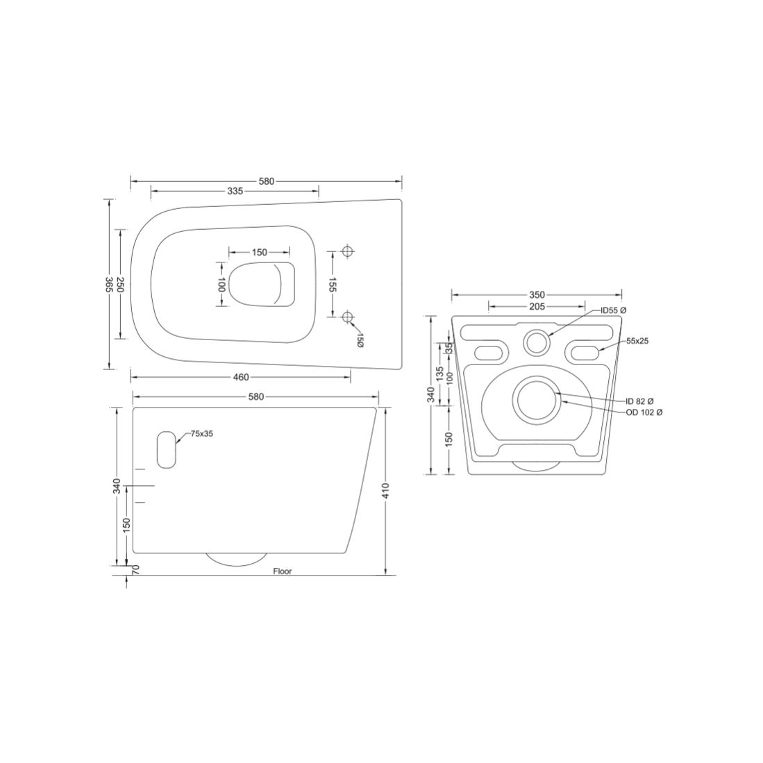 Washdown Wall Hung Closet Rim-Free in white | KB003E-R | Size : 580x365x340 mm, P-Trap : 250mm