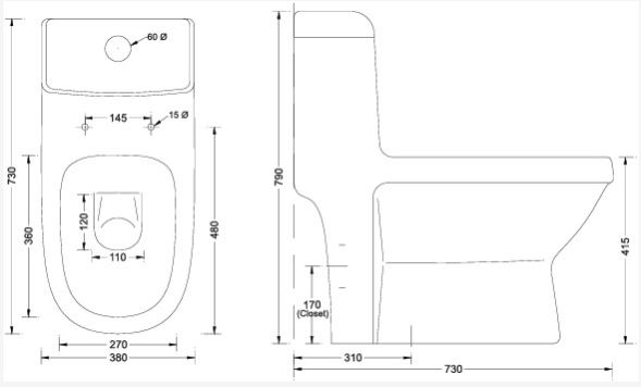 Wash Down One Piece EWC | KB3029 | Size : 730x380x790 mm, P Trap 180 mm