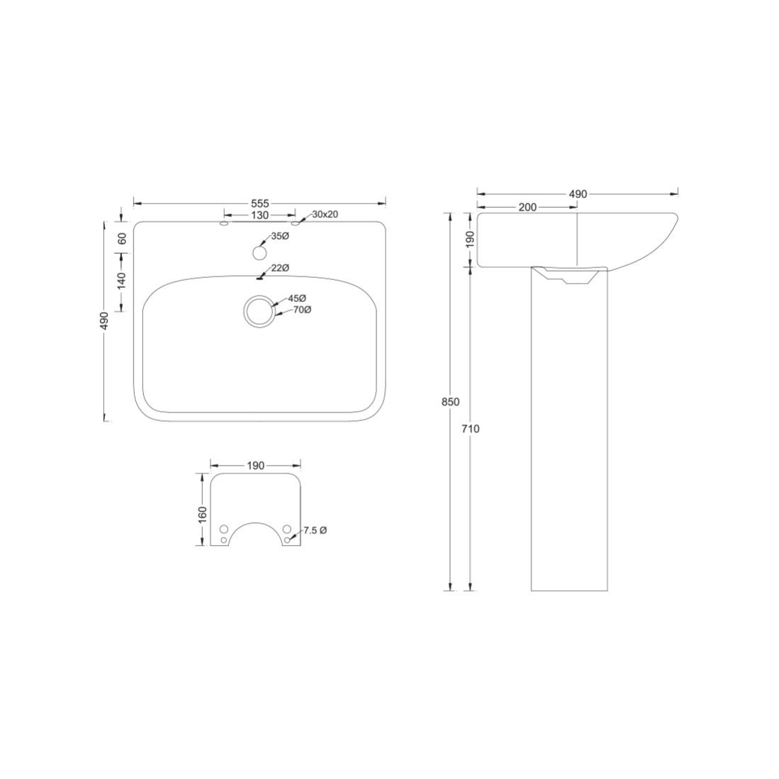Full Pedestal Wash Basin | KS252 | Size : Basin - 555x490x190 mm | Pedestal - 190x160x710 mm