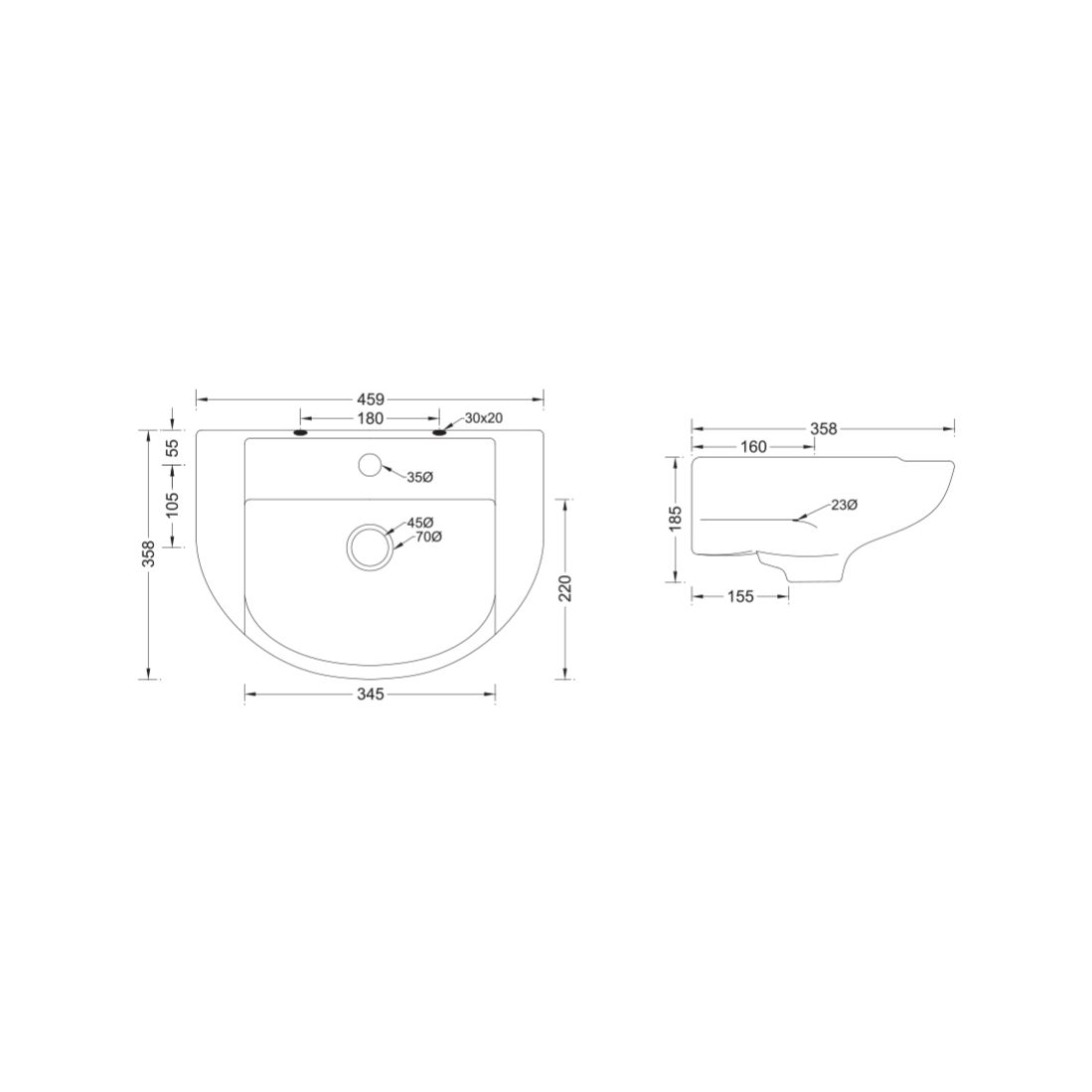 Wall hung wash basin in white | KS236 | Size : 459x358x185 mm
