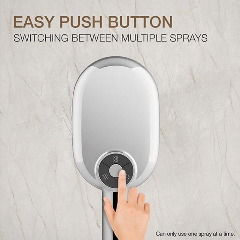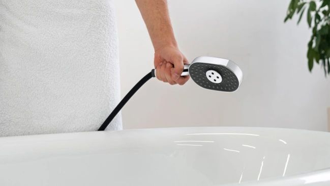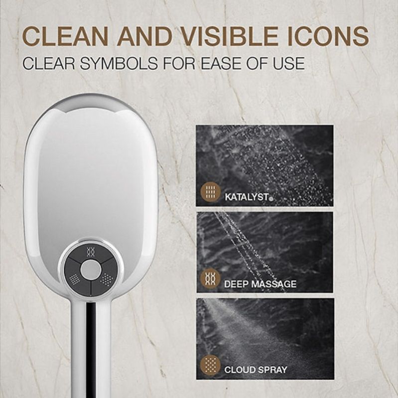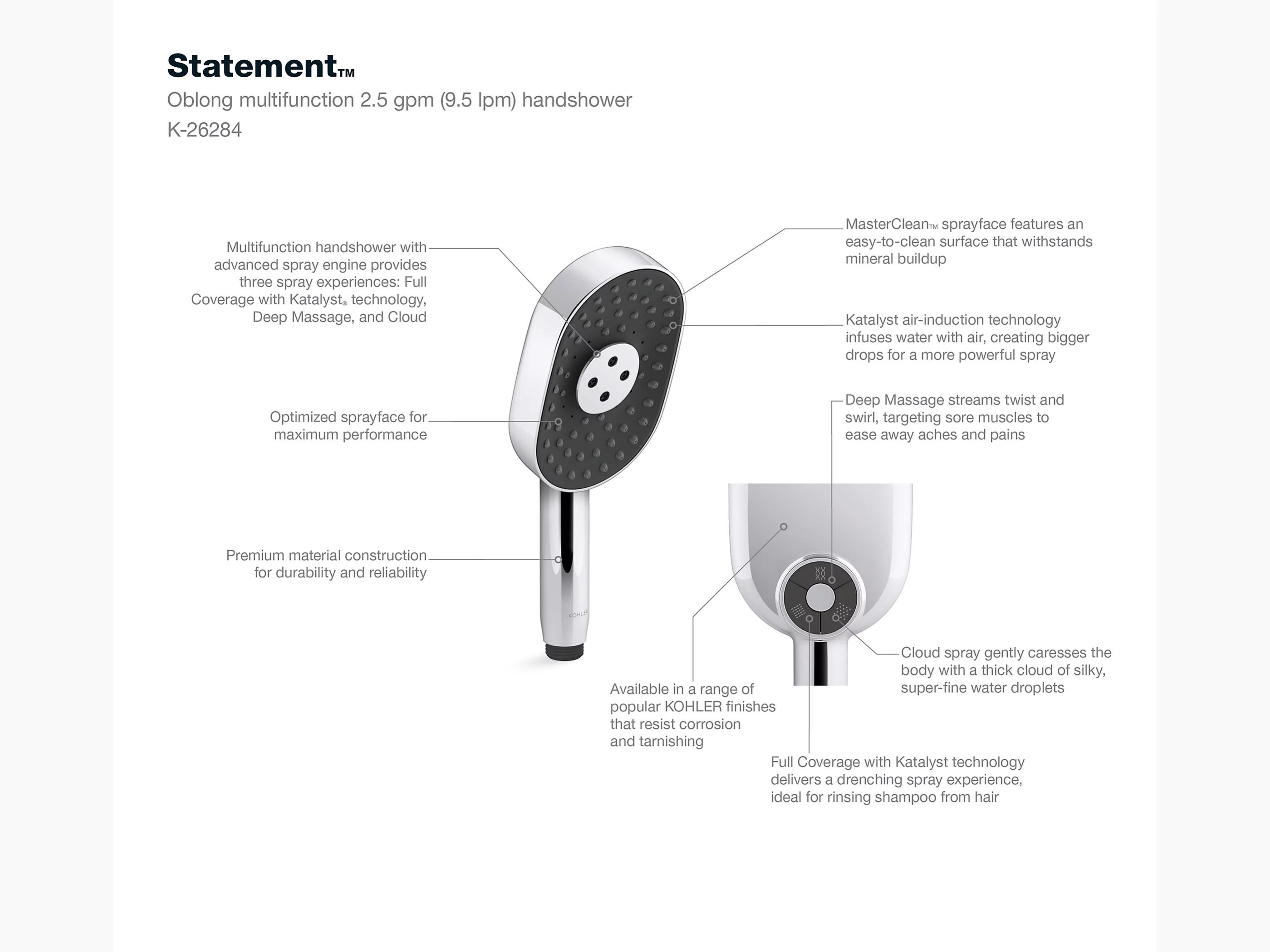 Multifunction handshower with advanced spray engine provides three spray experiences: Full Coverage with Katalyst technology, Deep Massage, and Cloud.